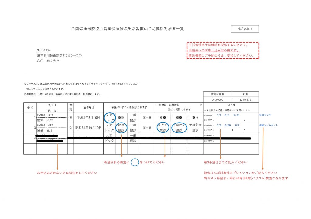 複数人一括申込の場合は、①協会けんぽの生活習慣病予防健診対象者一覧をご利用ください。